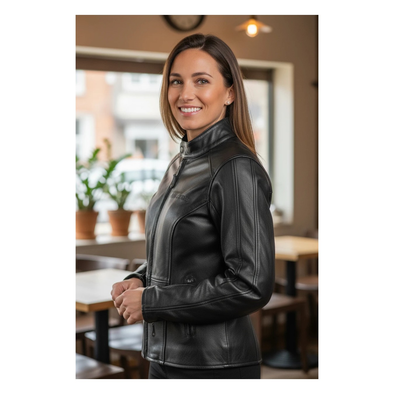 Lederjacke für Damen, an der Taille verschraubt, Schulter- und Ellbogenschutz, ideal für alle Frauen, die ein Lederkleidungsstück suchen, das nicht zu sportlich ist.