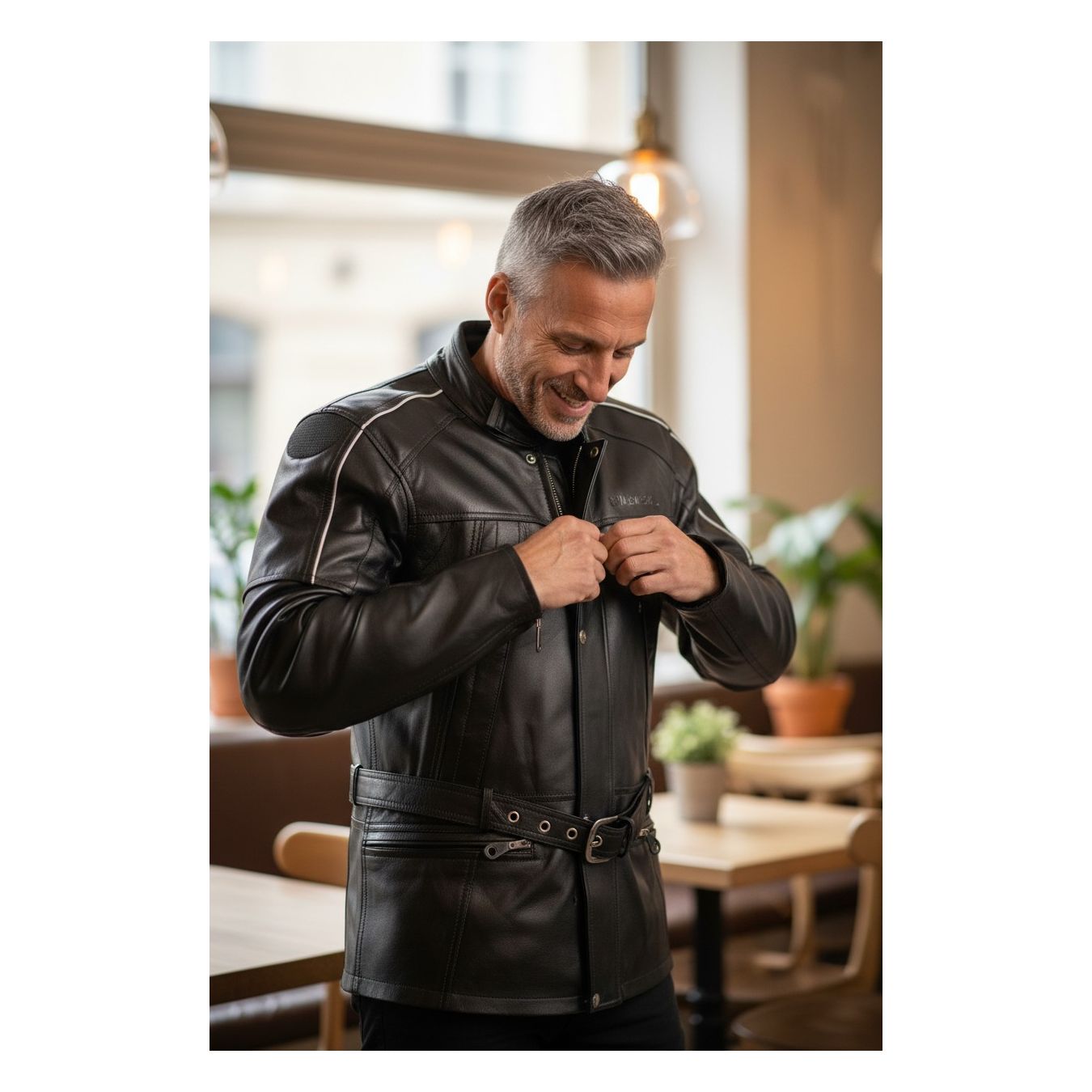 3/4 Lederjacke mit 100% wasserdichter Membran Taillengurt, Reißverschluss an den Seiten, um es bequemer im Sattel zu machen Reißverschlussöffnung entlang des gesamten Arms und seitlich an zwei Seiten des Rückens für bessere Sommerbelüftung Abnehmbare CE-geprüfte Protektoren an Schultern und Ellbogen Gehäuse für starren Rückenprotektor vorbereitet Rücken Konverter