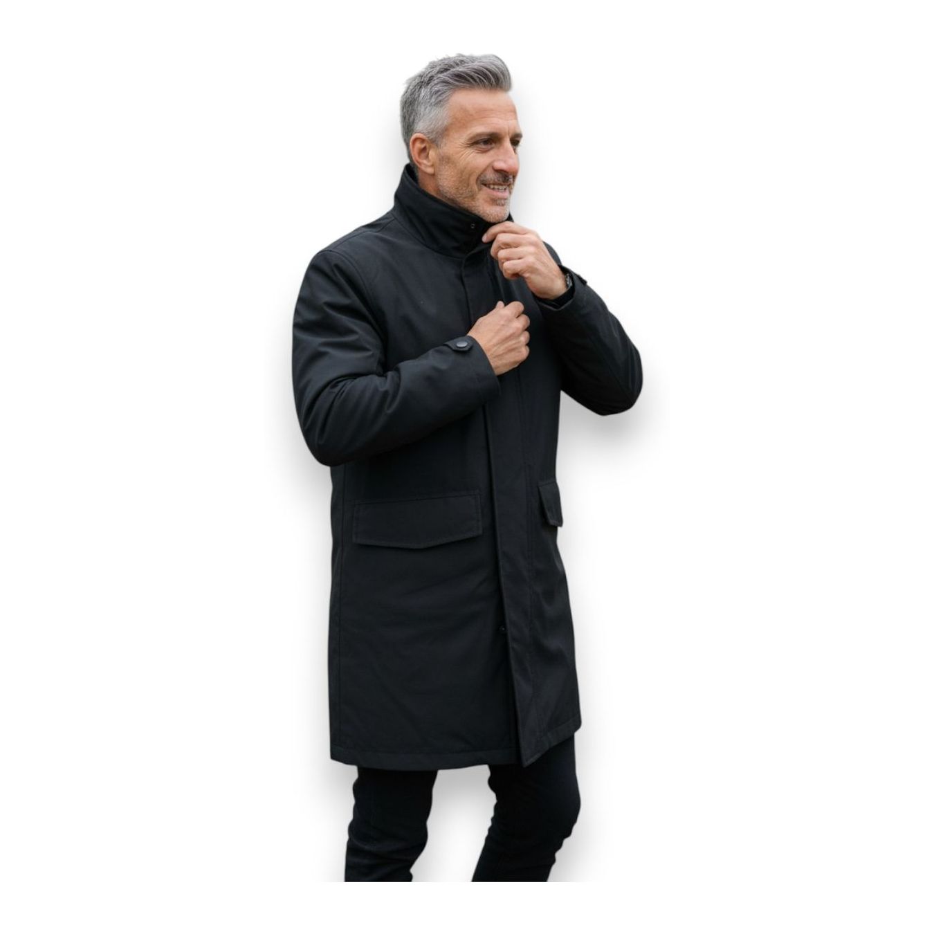 Elegante 7/8-Jacke, weich, leicht, aber gleichzeitig mit einer warmen (herausnehmbaren) Wattierung ausgestattet, die den Einsatz auch in kälteren Jahreszeiten ermöglicht. Geschätzt vom Rollerfahrer, der aus der Not heraus ein technisches Kleidungsstück mit Kleidung in Anzug und Krawatte kombinieren muss, ermöglicht die Länge des Kleidungsstücks, dass die Jacke perfekt vom Anzug bedeckt wird.