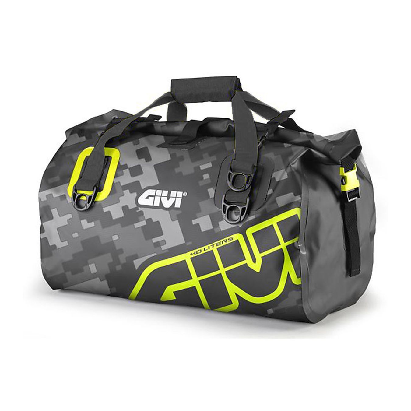 Wasserdichte Satteltasche 40 lt, graue und gelbe Tarngrafik.