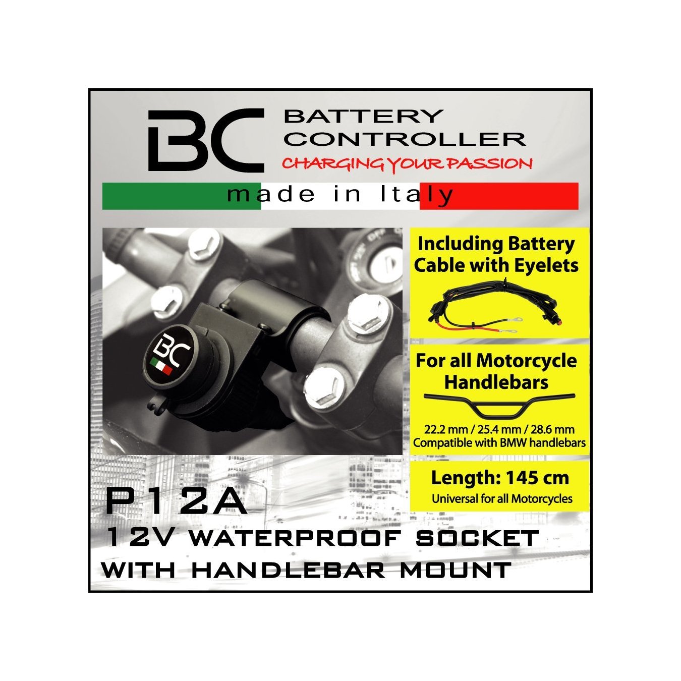 12V WASSERDICHTE ZIGARETTENANZÜNDERBUCHSE MIT LENKERHALTERUNG.KANN ZUM AUFLADEN VON ELEKTRONISCHEN INSTRUMENTEN VERWENDET WERDEN, DIE MIT EINEM ADAPTER FÜR DEN ZIGARETTENANZÜNDER AUSGESTATTET SIND (max. 2 Ampere - 12 V)