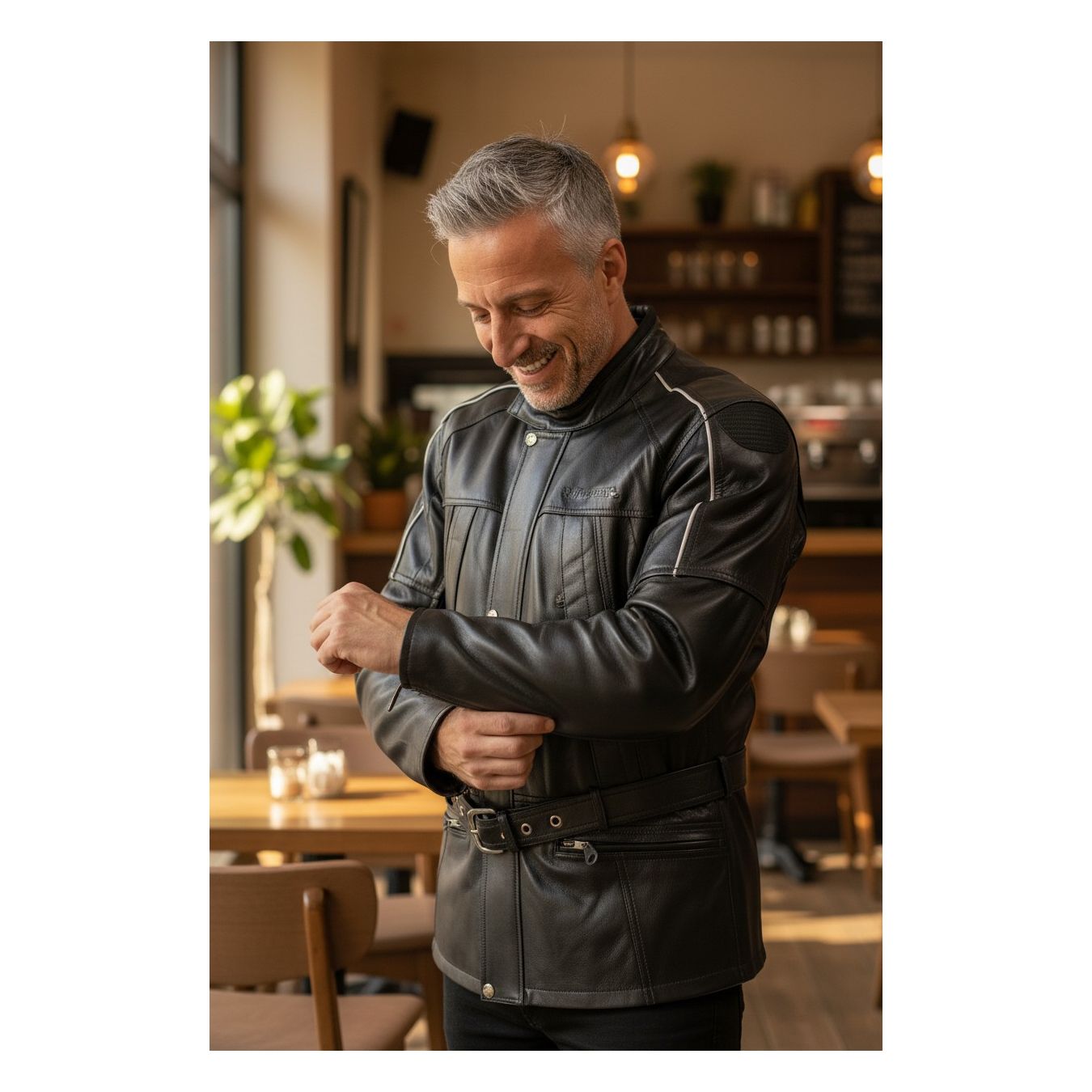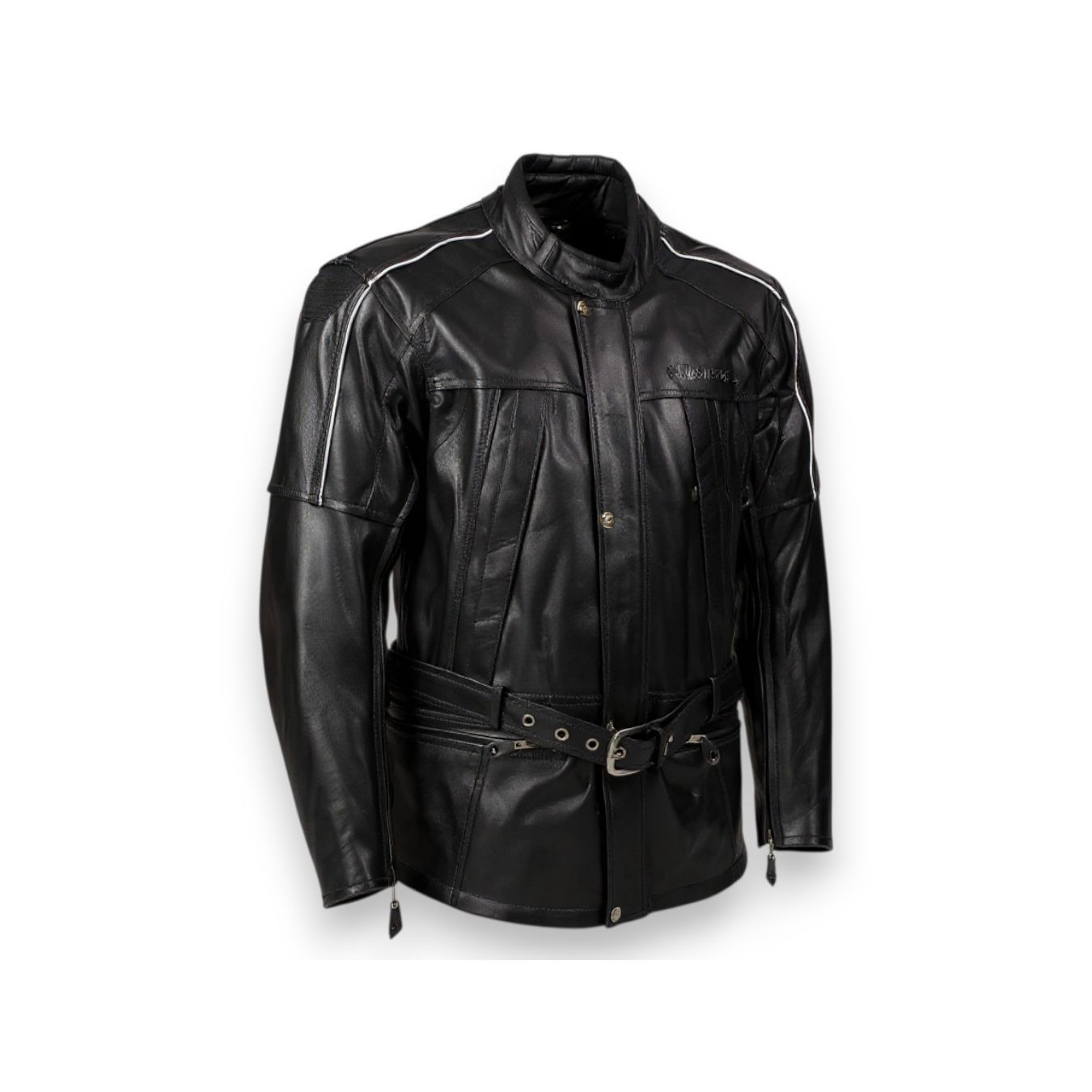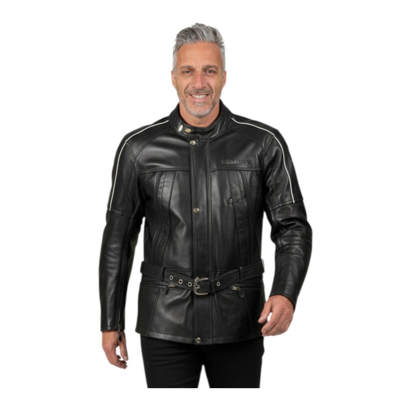 3/4 leather jacket with 100% waterproof membrane Waist belt, zip on the sides to make it more comfortable in the saddle Zip opening along the entire arm and laterally on two sides of the back for greater summer ventilation Removable CE approved protectors on shoulders and elbows Housing prepared for rigid back protector Back Converter