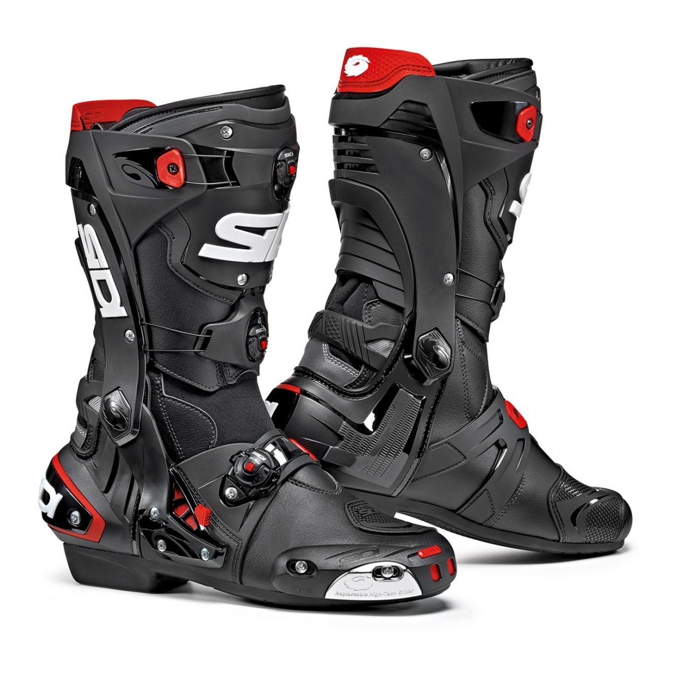 The Rex racing boots by Sidi are made, like most Sidi boots, using a new generation material called "Technomicro": a composite microfiber created by very thin threads that act like natural leather, but with the advantage of better resistance, a softer structure, a lighter weight, and water resistance. Extremely comfortable, as well as resistant, Rex boots have an innovative CLOSURE SYSTEM that allows a quick and easy fit. They are equipped with a practical side air intake, which can be operated by push-button. High quality at the highest levels, the Rex boots are equipped with a fiberglass reinforced slip soap, a softer fixed insert on the inside of the ankle to allow greater grip and contact with the bike, and shock absorbing system in the back and outside.