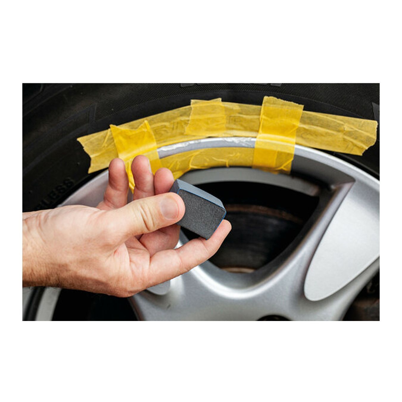 Contents: 1 pen with "liquid aluminium" putty for repair, 1 paint for rims, abrasive paper with 100 and 600 grain, 1 abrasive block, 1 pair of gloves