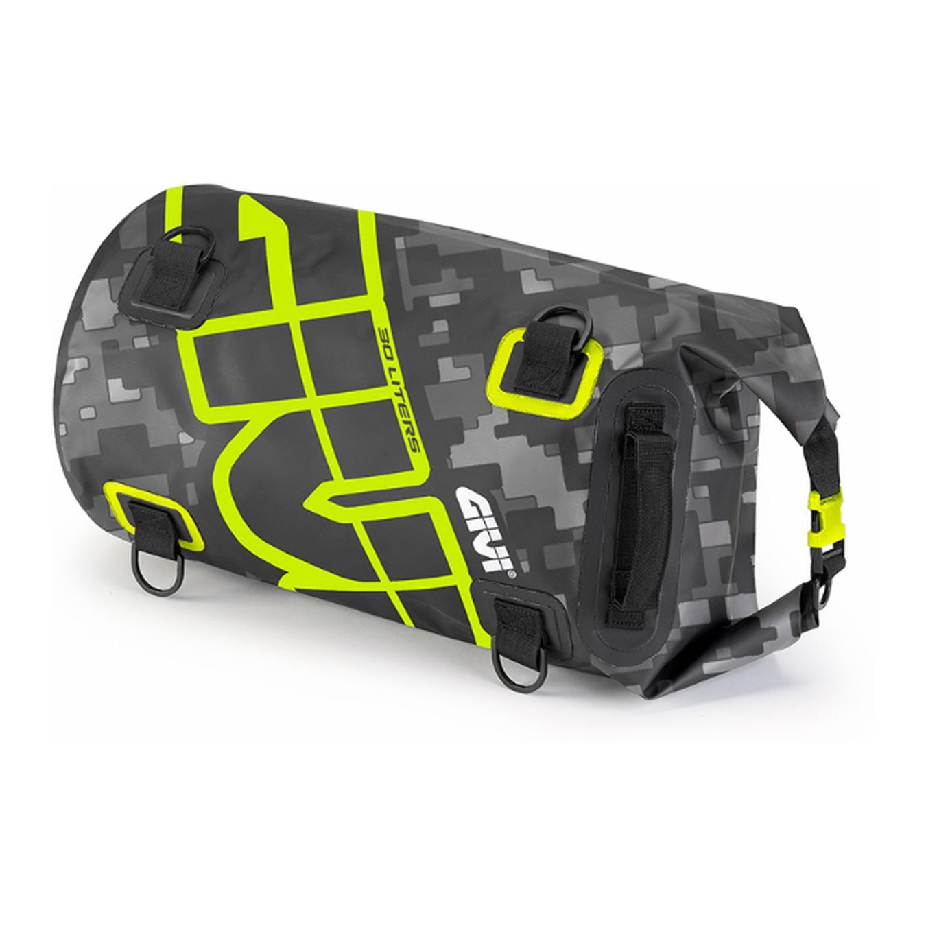 Waterproof saddle or luggage rack roller bag, 30 lt, gray and yellow camouflage graphics.