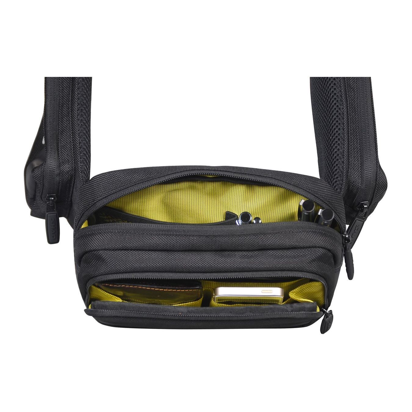 - Bolsillo externo con cremallera y dos compartimentos separadores.