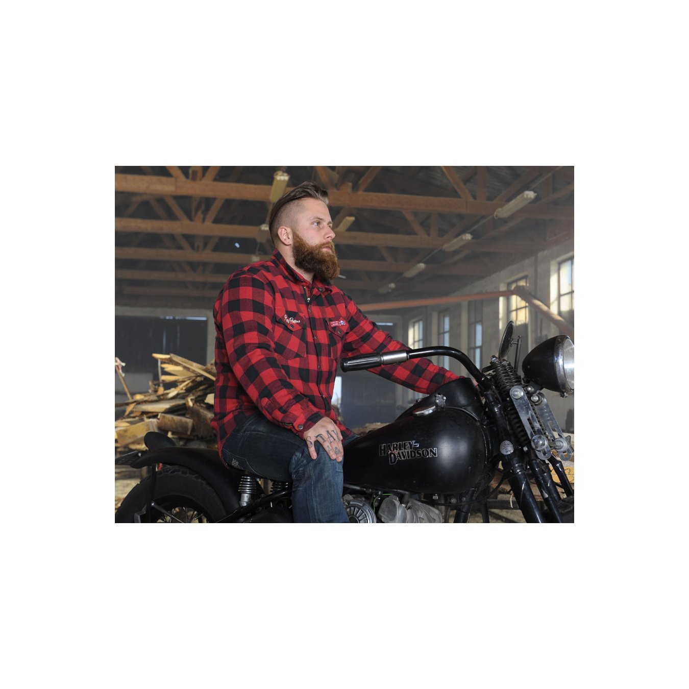 Camisa acolchada en mezcla de algodón 100% franela y Kevlar by DuPont 200gsm en la zona de espalda, hombros y codosAlojamiento vigilado para bolsillo protector de hombros, codos y espalda