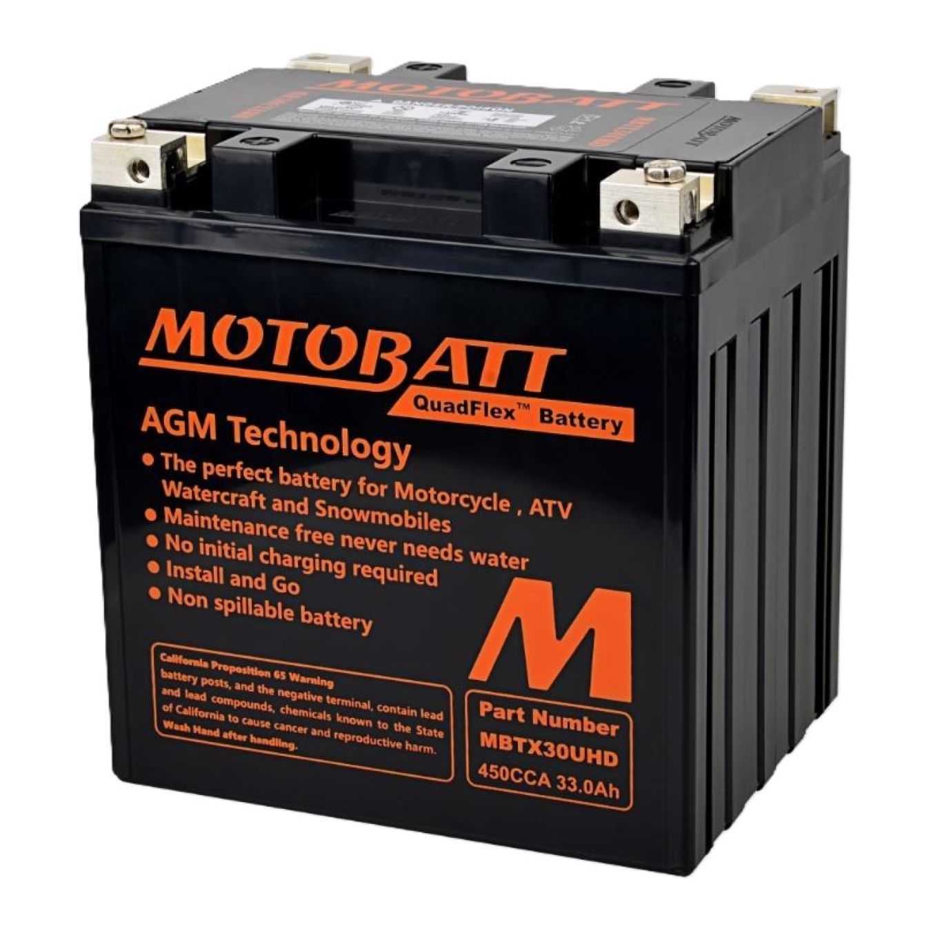 Le batterie Motobatt Quadflex, il primo e unico sistema a 4 terminali, propone il miglior equilibrio tra capacità CCA e Ampere ora. A causa dell'utilizzo dello spazio sprecato all'interno di una custodia per batteria standard, Motobatt massimizza le dimensioni delle piastre internamente. Inoltre, le griglie delle piastre sono rese più spesse, e questo con la densità aggiuntiva dell'incollaggio migliora la capacità di Amp Hour, la durata e gli Amp di avviamento a freddo. Motobatt ha completamente cambiato il mercato Powersport migliorando un vecchio design.