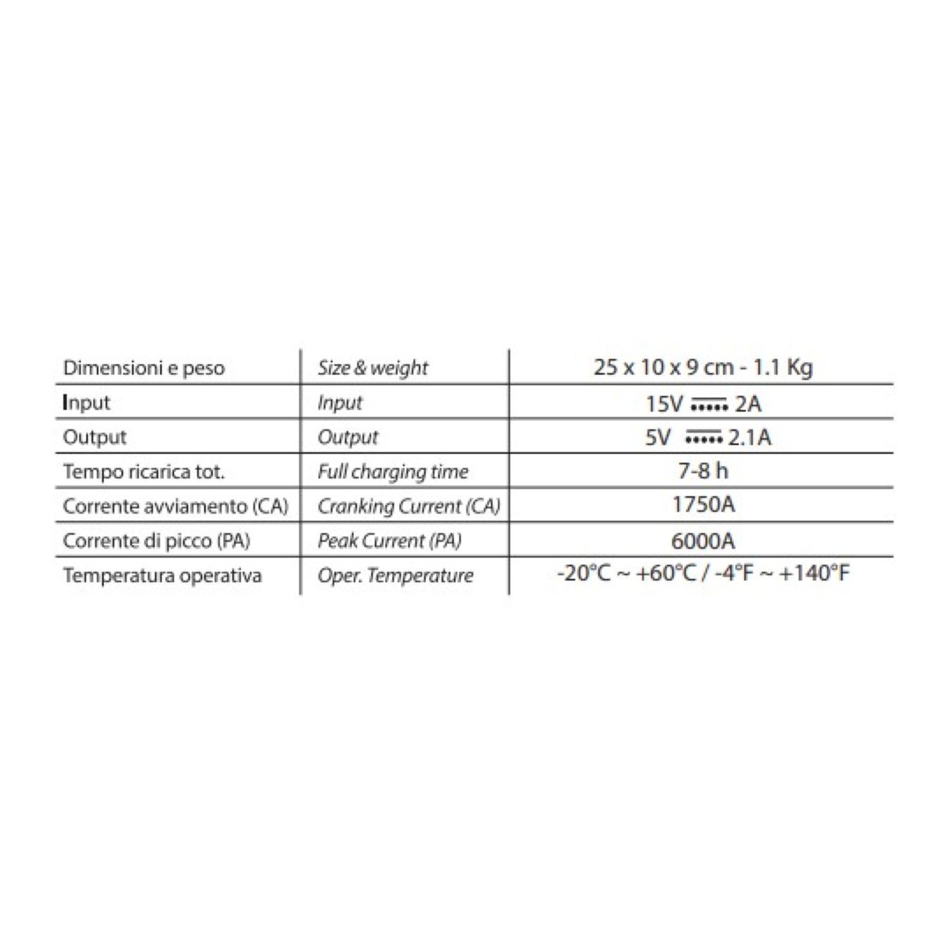 - * Compatto e portatile, può eseguire fino a 50 avviamenti per ricarica (batterie 12V).