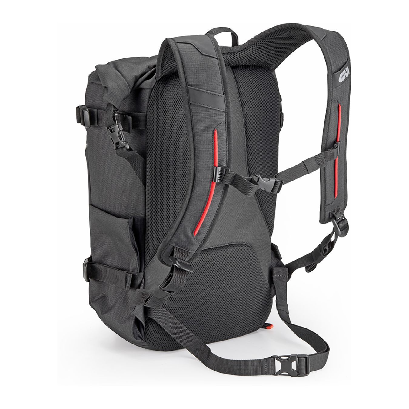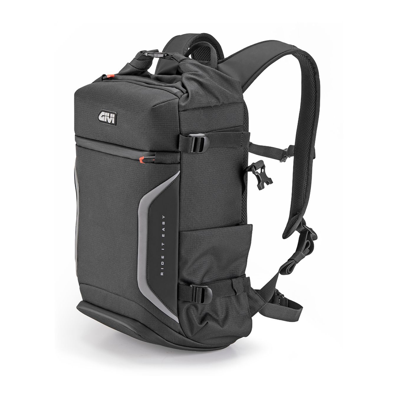 Gli spallacci ergonomici e regolabili garantiscono comfort anche durante lunghi viaggi in moto, mentre la cinghia di compressione in vita stabilizza il carico. Completano la struttura quattro punti di compressione laterali, che permettono di adattare lo zaino al contenuto, ottimizzando ingombri e stabilità.