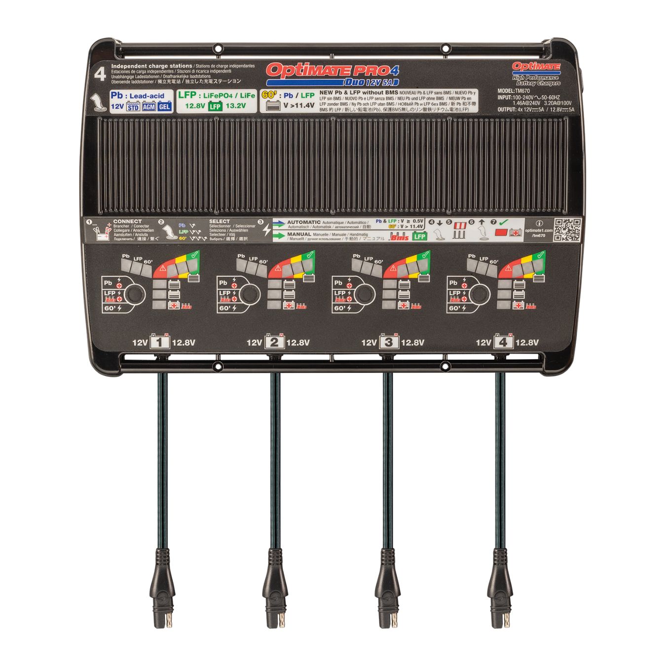 OptiMate PRO-4 DUO è il caricabatterie diagnostico automatico per 4 batterie al piombo-acido Pb da 12V (STD, AGM, GEL) e/o al litio LFP da 12.8V (LiFePO4/Litio Ferroso Fosfato).
