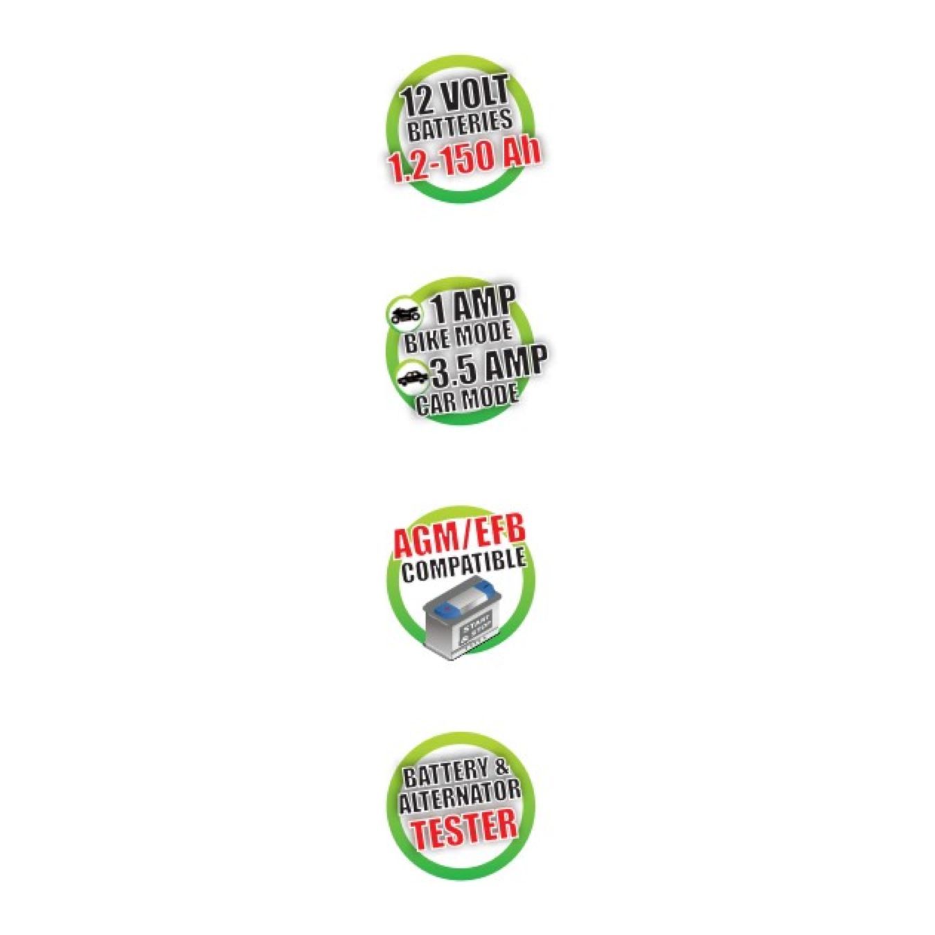 * 5 programmi: CAR 3.5 Amp Piombo acido, CAR 3.5 Amp Litio, BIKE 1 Amp Piombo acido, BIKE 1 Amp Litio, START&STOP per batterie auto AGM/EFB
